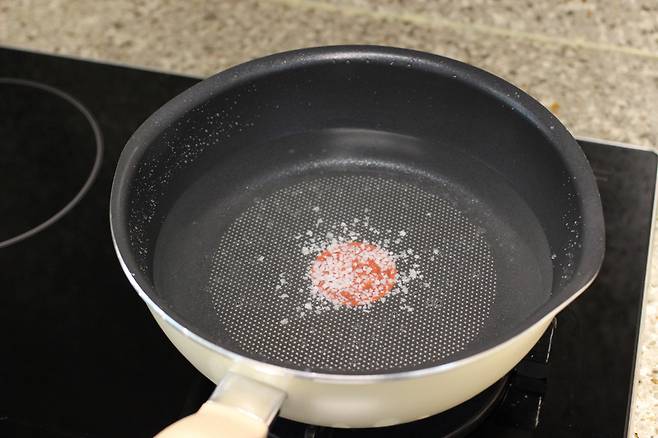 냄비에 물 1L 정도 붓고 굵은소금 1큰술 넣어 팔팔 끓여요. 데칠 때 소금을 넣어야 초록 빛이 더 잘 살아나요.