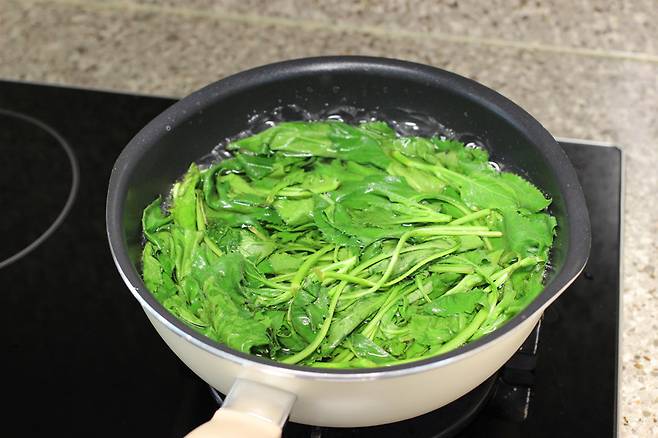 물이 팔팔 끓으면 다듬은 취나물을 넣고 약 1분 정도 데쳐요. 부드럽게 휘어질 정도로 데치면 돼요.