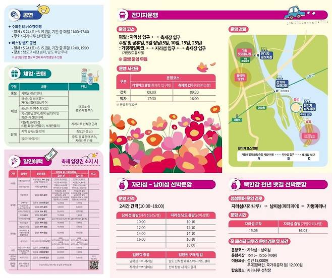 자라섬 입구에서 남도꽃정원 축제장입구까지 전기차를 운영합니다. 운임은 무료이며 첫차 09:00, 막차 18:00로 30분마다 운행됩니다.