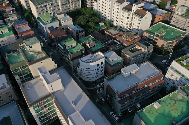 올림픽공원과 접한 오래된 주거 밀집지역에서 낡은 주택을 허물고 카페와 사무실, 다가구주택이 있는 집을 짓고 싶었던 건축주. 거대한 공원과 대비되는 조밀하고 복잡한 도시 구조에서 집은 도시와 어떻게 관계 맺어야 할까를 고민하며 건축은 시작되었다.