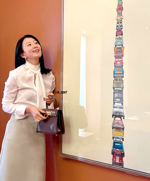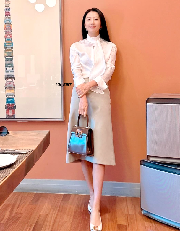요즘 그녀의 일상, 분위기로 말합니다. 햇살 아래 차분히 선 모습만으로도 눈이 가더라고요. 흰색 블라우스에 베이지 스커트, 거기에 작은 브라운 백 하나. 단정한데도 묘하게 여유롭고, 그 여유가 ‘부’의 기운처럼 느껴졌어요. 58세라는 숫자가 믿기지 않을 만큼, 피부와 표정이 편안했어요.