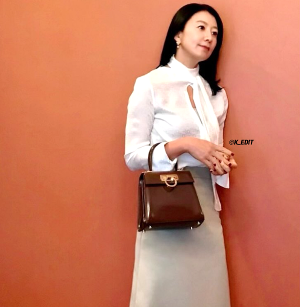 아무 장식 없는 블라우스는 소재부터 남다르고, 허리 라인을 살짝 잡아주니 몸매가 더 길어 보였죠. 스커트는 미묘하게 퍼지는 A라인이라 걸음마다 기품이 묻어났고요.