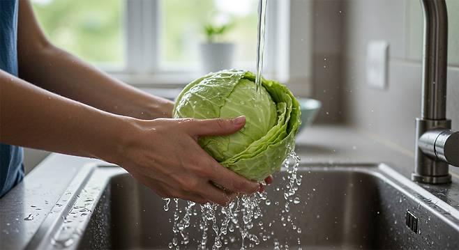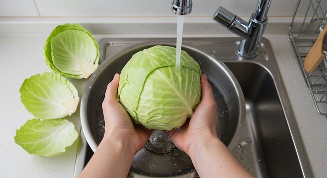 양배추 세척은 생각보다 간단하다. 겉잎 두세 장을 떼고, 물에 5분 정도 담근 뒤 흐르는 물에 세 번 헹궈주면 끝이다. 하지만 채썰어 식초물에 담그는 방식은 피해야 한다.