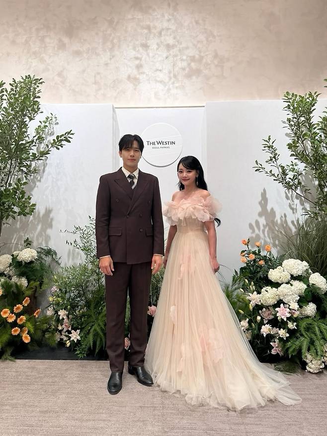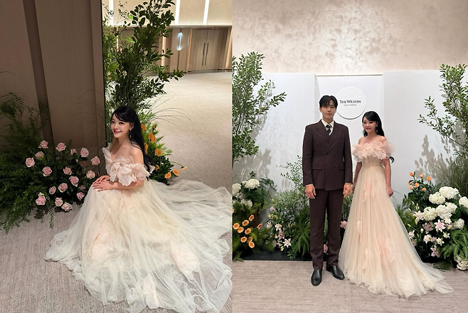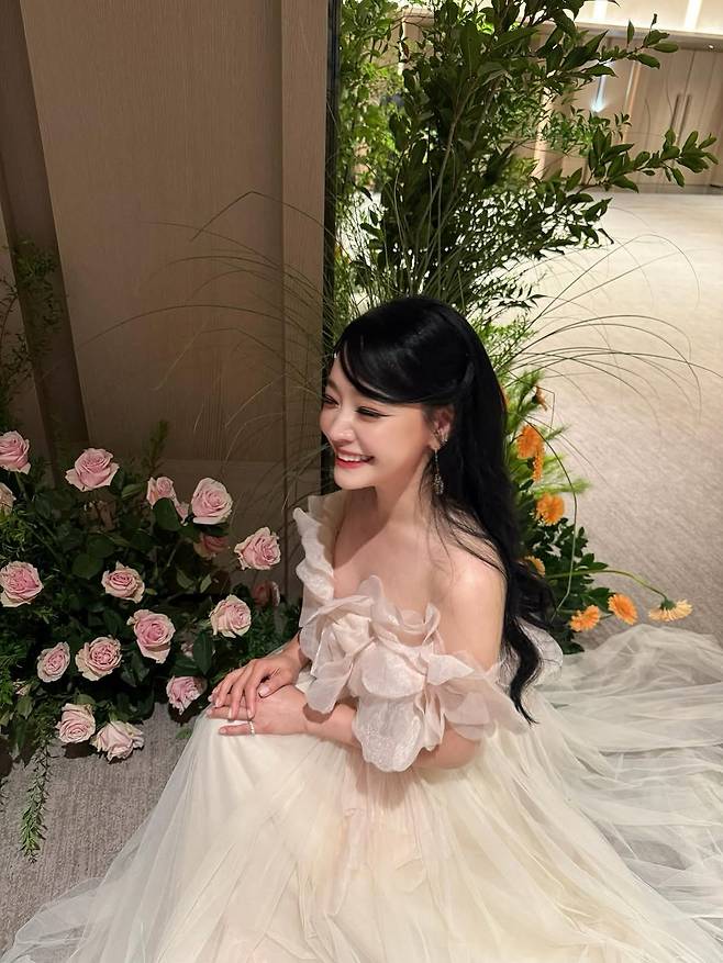 사진 속 그녀는 어깨의 꽃장식이 돋보이는 아이보리 빛깔의 풍성한 튤 드레스를 입었죠.