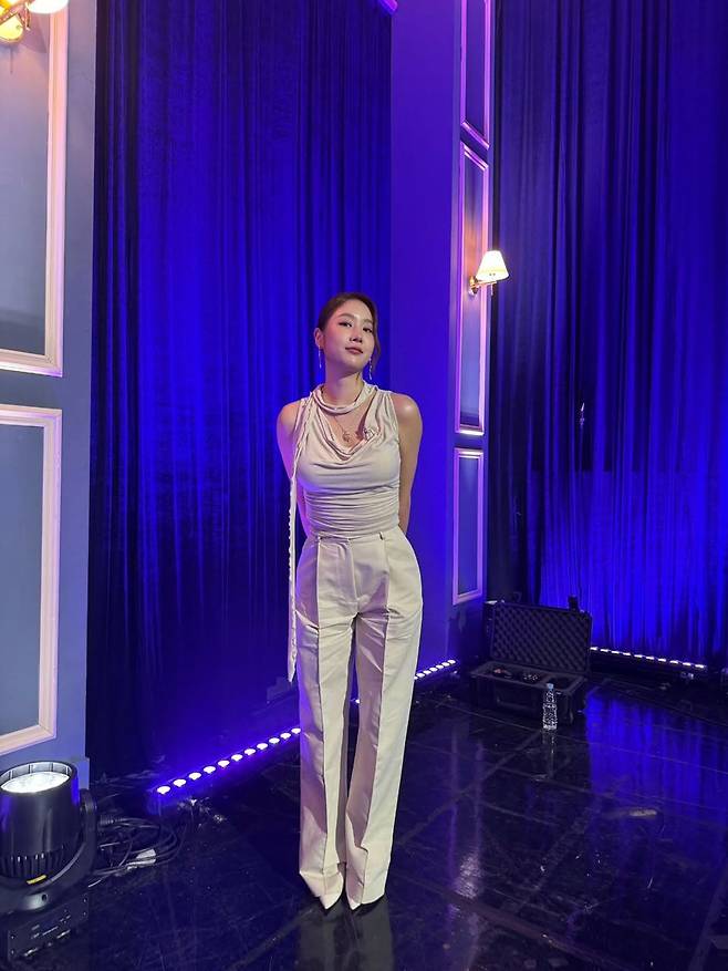 첫 번째 룩에서는 은은한 광택이 감도는 베이지 컬러 슬리브리스 드레이프 톱에 하이웨이스트 핀턱 슬랙스를 매치해 포멀하면서도 우아한 실루엣을 완성했다. 깔끔하게 묶은 헤어와 드롭 이어링이 더해져 세련된 분위기를 배가시켰다.