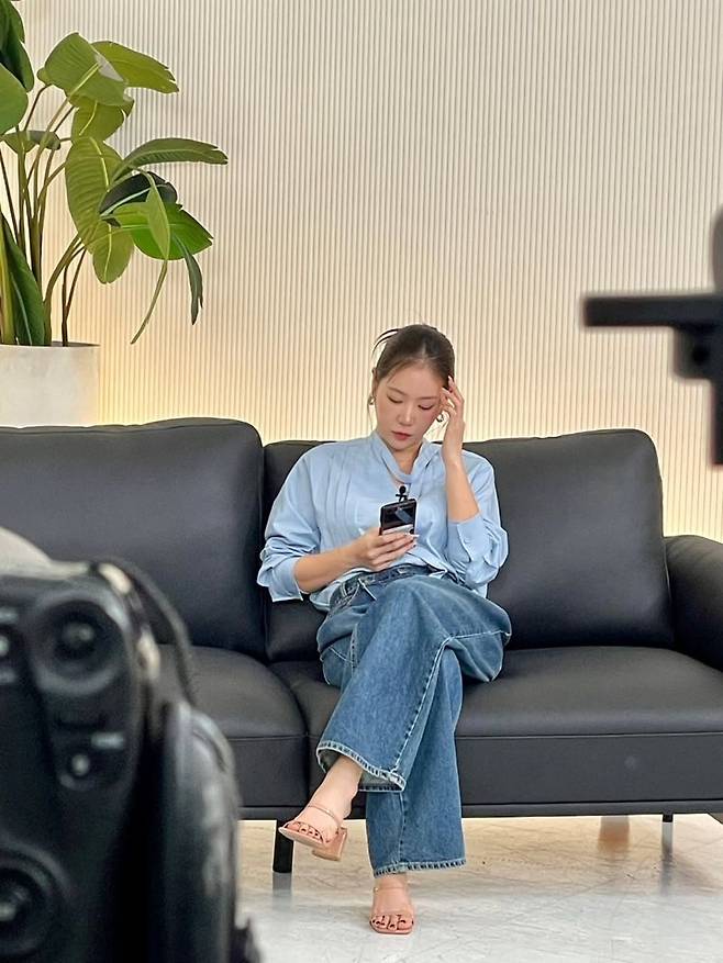두 번째 컷에서는 하늘색 셔츠와 와이드 데님 팬츠 조합으로 내추럴한 오피스룩을 선보였다. 발등을 덮는 여유로운 기장의 데님과 누드톤 슬리퍼 힐이 편안하면서도 꾸민 듯 안 꾸민 듯한 느낌을 자아낸다.
