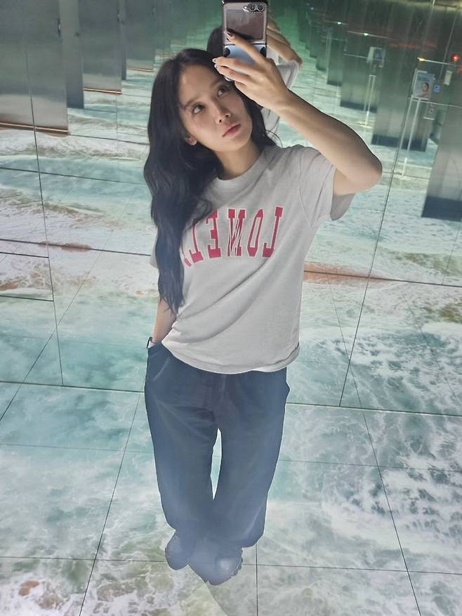 세 번째 셀피에서는 레터링 포인트가 돋보이는 라이트 그레이 티셔츠에 다크 네이비 팬츠를 매치해, 무심한 듯 멋스러운 꾸안꾸 스타일을 연출했다. 헐렁한 핏의 팬츠와 자연스럽게 흐트러진 웨이브 헤어가 일상 속 자유로운 매력을 강조한다.