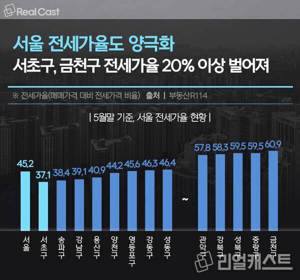 서초구와 금천구 전세가율 차이 23.8%P …전세가율도 양극화