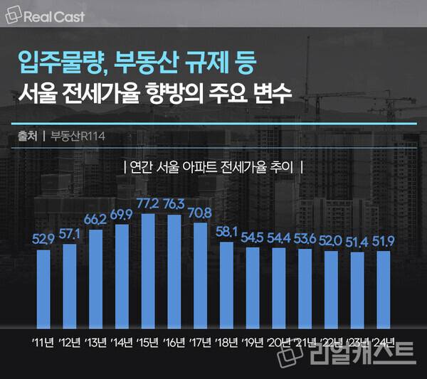2024년 51.9%였던 서울 전세가율이 올해는 45.2%로 줄었으니 그만큼 갭투자자의 투자 부담도 가중됐습니다.