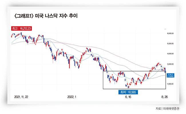 "나스닥은 5월부터 8월 초까지 박스권에서 움직이다 박스권을 상향 돌파하며 단기 랠리를 이어갔다. 최근 다시 박스권으로 진입하고 있다(그래프1 참조). 흐름을 지켜봐야겠으나, 다시 박스권에 머무른다면 조정 흐름은 좀 더 이어질 것이다. 현재 나스닥 차트가 기술적으로 단기 헤드앤드숄더형(양쪽 어깨와 가운데 머리가 만들어지는 추세 전환 패턴)이 완성돼 하락N자형(급락 후 약한 반등 패턴이 이어지는 하락 추세 차트)으로 진행될 수 있기 때문에 조정이 지속될 가능성이 크다(그래프2 참조). 나스닥 지지선은 11,500 내외로 판단된다."