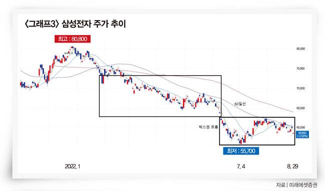 "삼성전자의 올해 60일 이평선이 강력한 저항선 역할을 하고 있다. 2월, 5월, 7월, 8월에 걸쳐 이러한 모습이 나타났다. 삼성전자는 6월 13일 갭하락 이후 현재까지 5만6000원~6만3000원에서 박스권 움직임을 보이고 있다(그래프3 참조).