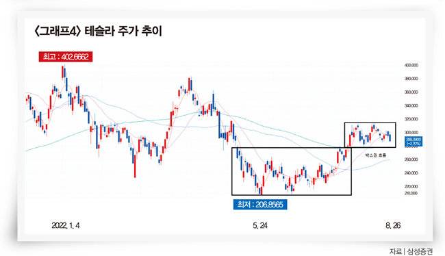 "테슬라는 5~7월 단기 저점에서 박스권을 형성했다. 8월에 이 박스권을 돌파하면서 상승세를 이어갔다. 8월 이후 형성된 박스권에서 2중 천장을 형성한 조정 흐름이 이어지고 있다(그래프4 참조). 기술적 분석으로 테슬라의 의미 있는 저점은 280달러 내외였다. 8월 31일 이 지지선이 무너졌다. 이런 추세가 지속되면 테슬라 주가는 한 단계 더 조정받을 가능성이 크다. 8월 들어 추세적으로 거래량이 감소 중인데, 이는 투자심리가 얼어붙고 있다는 것으로 해석할 수 있다."