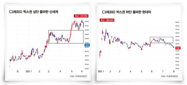 "박스권에서 하향 돌파한 주가가 계속 유지된다면 이전 박스권의 하단선이 새로운 상단선이 된다. 지난해 현대차 주가를 보면 박스권 하단에 형성됐던 지지선이 하향 돌파하면서 저항선으로 바뀐다(그래프6 참조)."