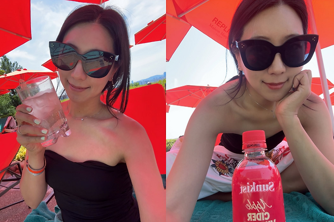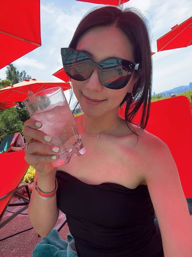 사진 속 그는 레드 파라솔 아래 블랙 튜브톱 수영복을 입고, 커다란 블랙 선글라스로 포인트를 더한 채 청량한 음료를 들고 환하게 웃고 있다.