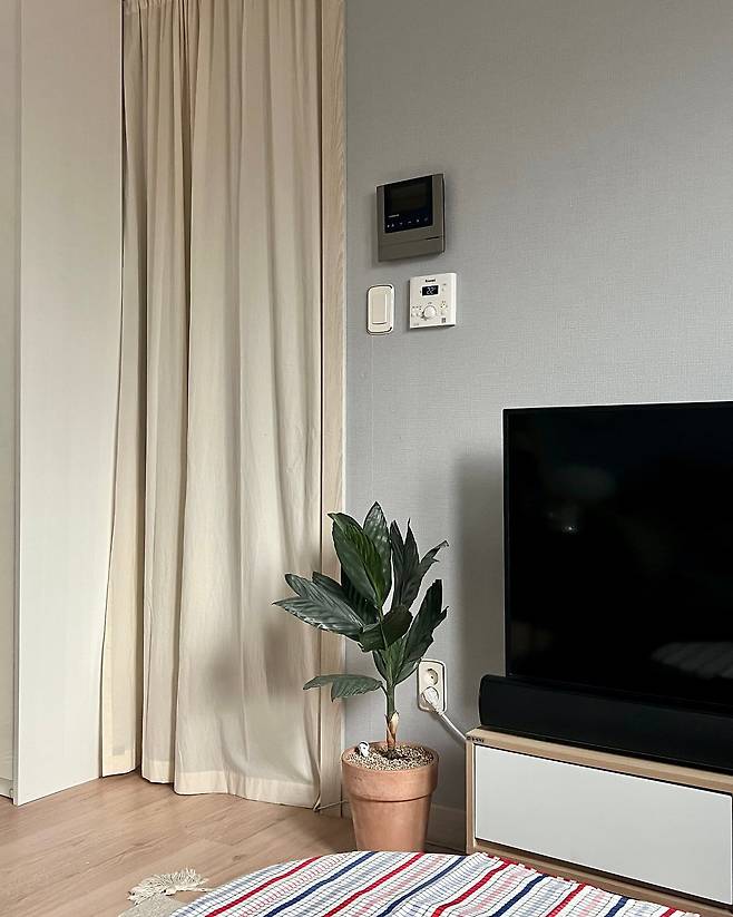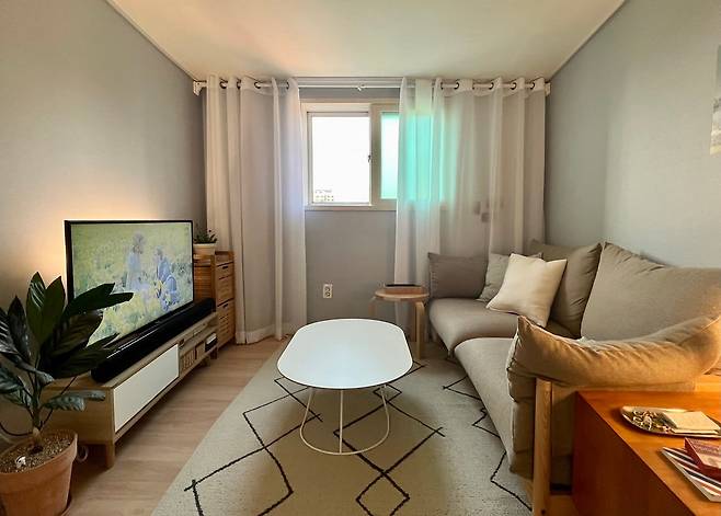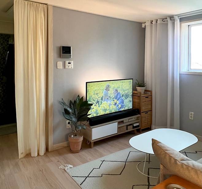 그럼 거실부터 소개해 볼게요. 사실 거실은 볕이 잘 들지 않기에 거의 1년 동안 커튼도 달지 않은 채 대충 살고 있었는데요. 최근 작년에 여름이 되면서 창문을 열고 지내다 보니, 살짝 시야만 가려줄 커튼을 달고 싶더라고요. 그래서 쉬폰 커튼을 달아주었더니 거실 전체의 분위기가 살아났어요!