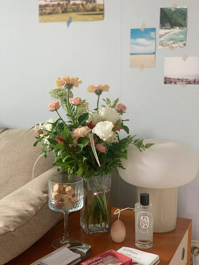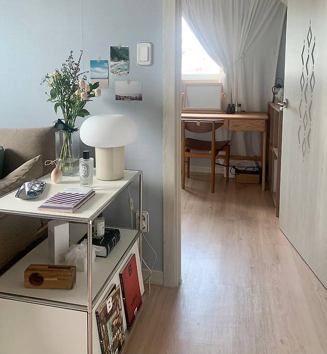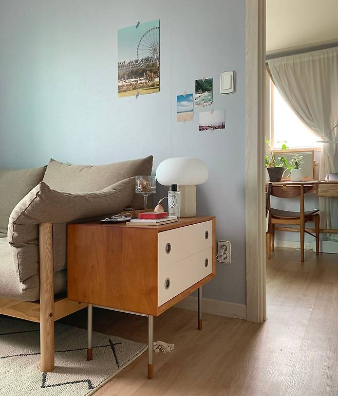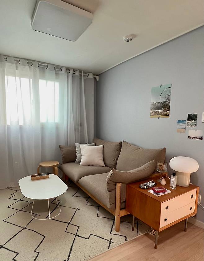 소파 옆의 협탁에는 조명과 룸스프레이, 안경 트레이 등 다양한 소품을 올려두었어요.