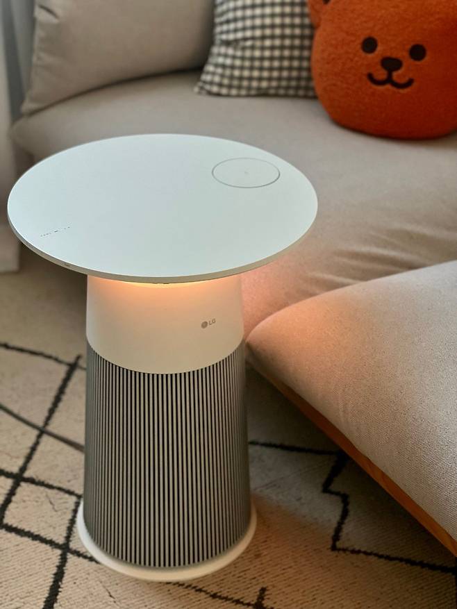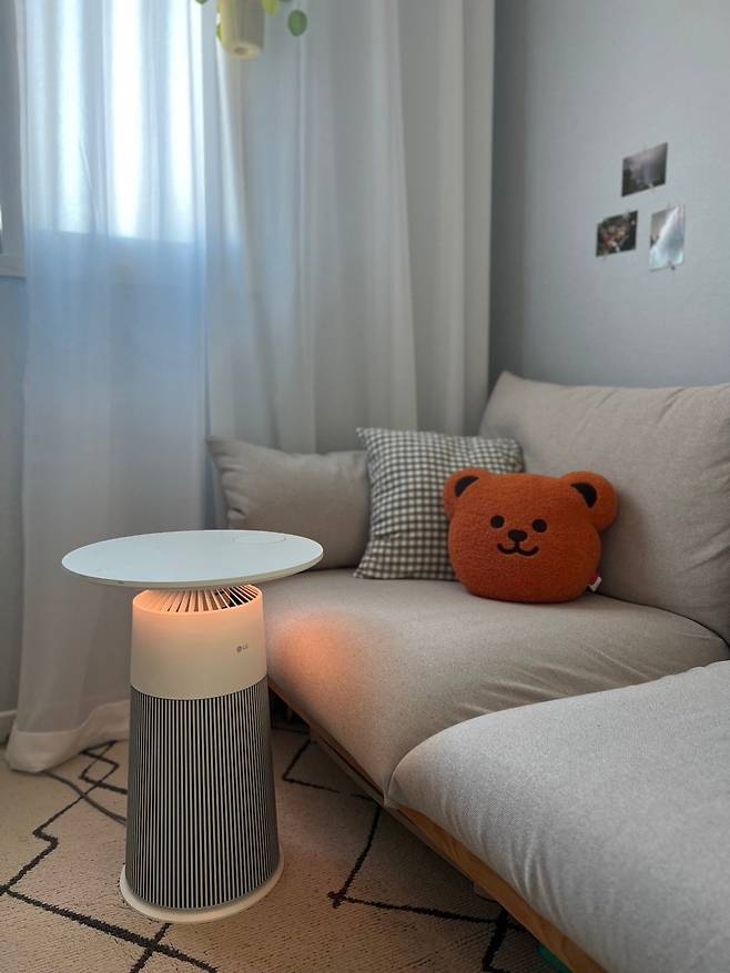 최근 거실에 들여온 가구는 바로 'LG 공기 청정기'예요. 상판이 테이블처럼 생겨서 소파 앞에 두어도 잘 어울려요. 또 은은하게 나오는 불빛도 거실에 분위기를 더해주어서 좋아요.
