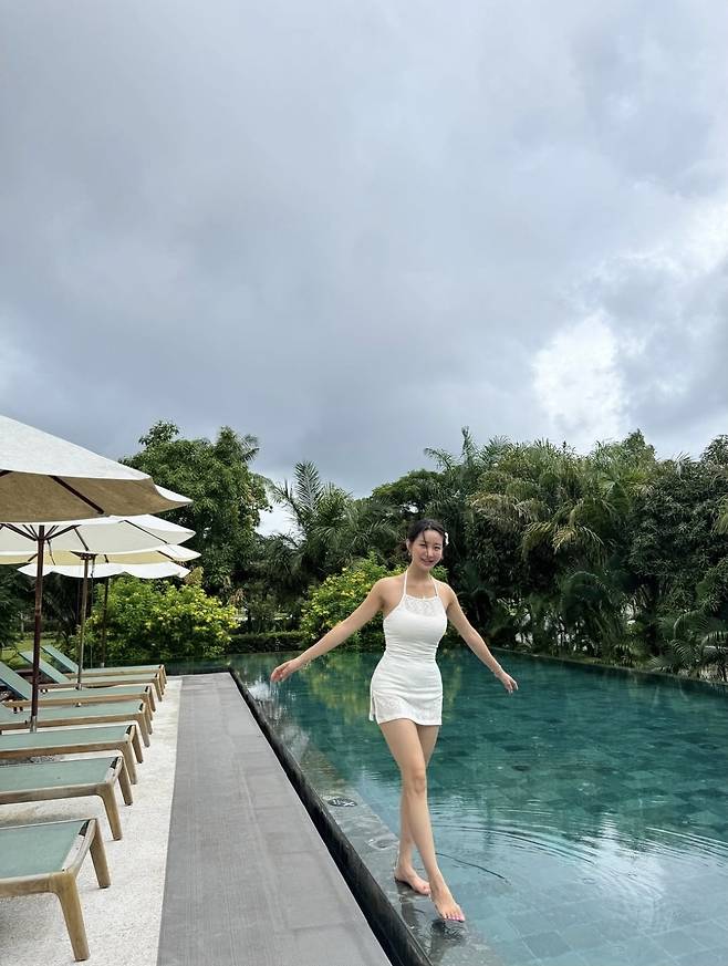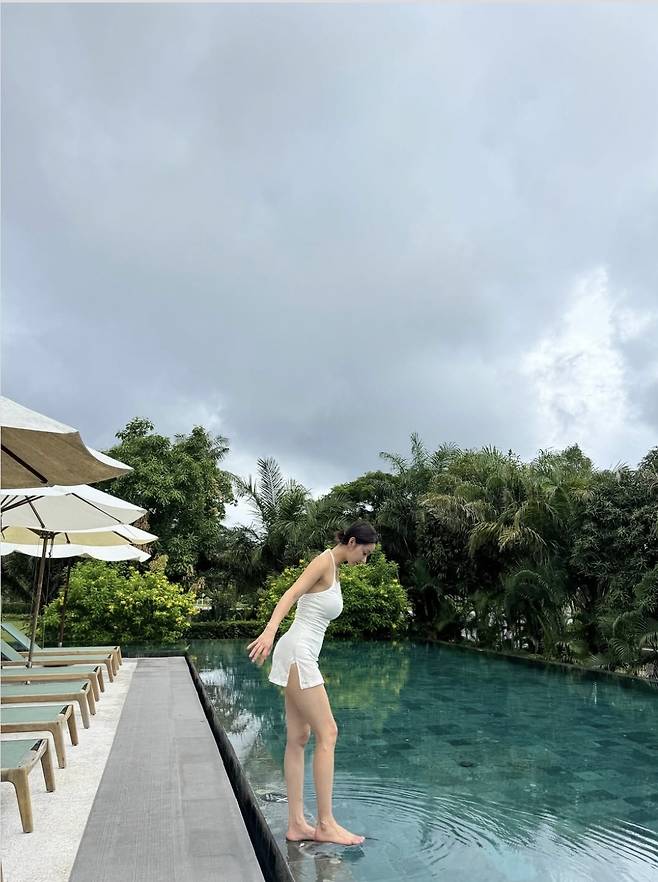 한그루는 레이스 디테일이 더해진 미니 원피스 형태의 화이트 수영복을 착용해 군살 없는 몸매와 완벽한 비율을 자랑했습니다.