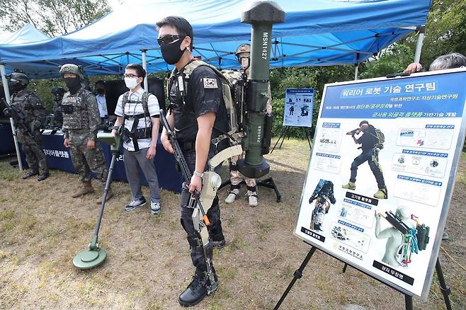 한국 역시 국방과학연구소(ADD)와 민간 기업들이 협력해 외골격 슈트 개발에 나서고 있다. 현재는 주로 하체 보조형 장치 연구가 진행 중이며, 군장 하중을 절반 이상 줄여주는 시제품이 공개된 바 있다. 국방부는 향후 전고체 배터리 기술과 결합해 한국형 강화 외골격 슈트를 실전 배치하는 것을 목표로 하고 있다.