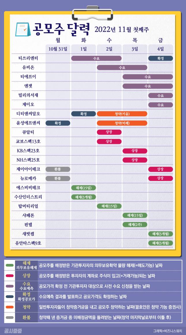 이번주(10월31일~11월4일)에도 티쓰리엔터테인먼트와 밀리의서재 등 6개 기업이 기관 수요예측을 앞두고 있고요. 디티앤씨알오와 윤성에프앤씨 2개 기업이 일반청약을 진행합니다.