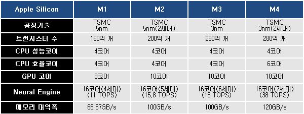 통합 메모리 대역폭도 전작 M3는 기존 M2와 동일한 100GB/s를 유지했는데, CPU 코어가 증가한 M4는 20% 향상된 120GB/s로 올라가 프로세서 전체 성능 향상에 기여하고 있다.
