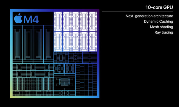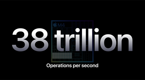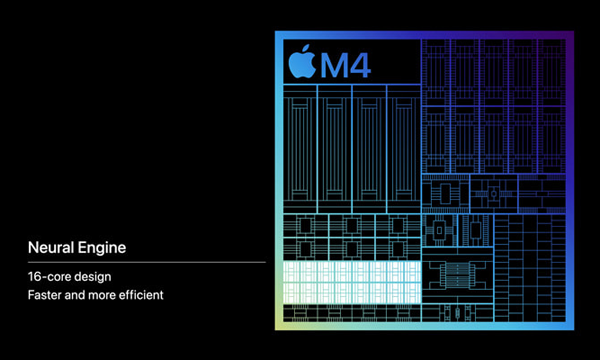 CPU 내부의 차세대 ML 가속기와 고성능 GPU, 그리고 더 커진 메모리 대역폭이 뉴럴 엔진에 더해져 M4는 AI에 있어 현존하는 어떤 AI PC의 NPU보다도 강력한 칩이 되었다는 것이 애플의 설명이다. 4K 영상의 배경에서 대상을 분리해내는 일도 아이패드용 파이널 컷 프로에서 탭 한 번으로 가능해진다.