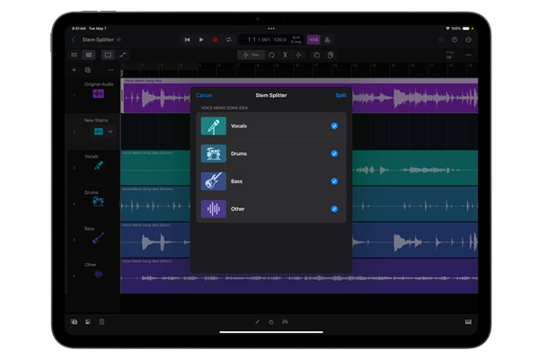 드럼 또는 보컬만 샘플링하고 싶은데 오리지널 트랙이나 스템 파일이 없다면 로직 프로에서 스템 스플리터(Stem Splitter)를 통해 어떤 녹음본이든 4개의 구분된 파트(음성, 베이스, 드럼, 그외 악기)를 빠르게 추출한다. 이 과정은 M4의 파워로 기기 내에서 아주 빠르게 이루어져 곧바로 리믹스 작업을 계속 이어갈 수 있다.