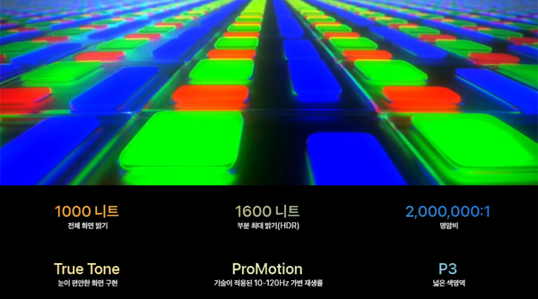 애플은 OLED 기술이 각 픽셀별로 빛은 물론 색까지 발광하여 정밀한 표현이 가능하지만 아이패드 프로 사용자들이 기대하는 XDR 성능을 구현하기에는 충분한 밝기가 나오지 않아 2장의 OLED 패널에 나오는 빛을 합해 화면 전체에서 경이로운 밝기를 보여주는 최첨단 '탠덤(Tandem) OLED'를 개발했다고 밝혔다.