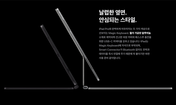 초슬림 디자인의 아이패드 에어에 맞춰 완전히 새로워진 매직 키보드도 새로운 아이패드 프로와 어울리는 2가지 색상으로 출시된다. 훨씬 얇고 더욱 가볍게 다시 디자인하고 사용자들이 좋아하는 플로팅 디자인으로 펼쳐진다. 새로운 매직 키보드에는 기능 키 열이 추가되어 화면 밝기 등 편리한 제어 기능을 빨리 실행할 수 있으며, 알루미늄 팜레스트와 햅틱 피드백으로 반응성이 향상된 더 커진 트랙패드를 장착하여 맥북을 사용하는 느낌으로 아이패드 프로를 쓸 수 있다.