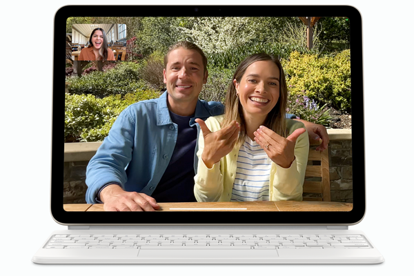 새로운 디자인을 적용한 아이패드 에어는 1,200만 화소 울트라 와이드 전면 카메라가 이제 세로가 아닌 가로 상단에 배치된다. 머신 러닝(ML)을 통해 자동으로 모든 인물을 시야에 담아내는 센터 스테이지 기능을 지원하며, 매직 키보드와 같은 액세서리와 연결해서 노트북처럼 사용할 때 편의성이 향상된다.