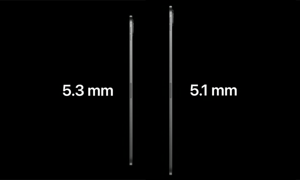 아이패드 프로 11 모델은 5.3mm, 아이패드 프로 13 모델은 5.1mm이며 심지어 예전에 출시된 휴대용 뮤직 플레이어 아이팟 나노(iPod Nano)보다도 얇은 두께로 역대 가장 얇은 애플 제품을 표방하고 있다.