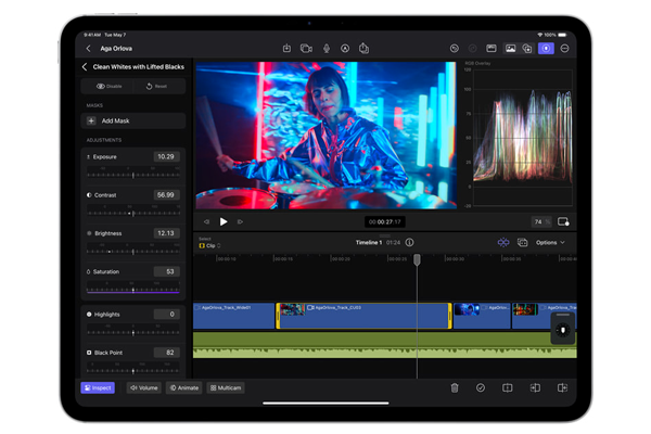 그 밖에 새로운 아이패드 프로의 M4 칩을 통해 렌즈 블러(Lens Blur) 같은 사실적인 보케 효과와 카메라 초점 변경 애니메이션을 실행하거나 수백 개의 트랙과 변경사항을 실시간으로 적용하는 등 50% 향상된 성능을 활용할 수 있다.