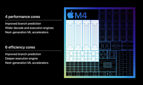 280억개 이상의 트랜지스터를 사용한 M4는 기본형 M 시리즈 가운데 처음으로 효율 코어 숫자를 6개로 늘려 4개의 성능 코어와 함께 10코어 CPU를 구현했다. 성능 코어와 효율 코어 모두 차세대 머신 러닝(ML) 가속기를 지원하므로 그만큼 AI 성능이 개선된 거라고 볼 수 있다. 애플은 이전 세대 아이패드 프로에 들어간 M2보다 CPU 성능이 최대 50% 더 빨라졌다고 밝히고 있다.