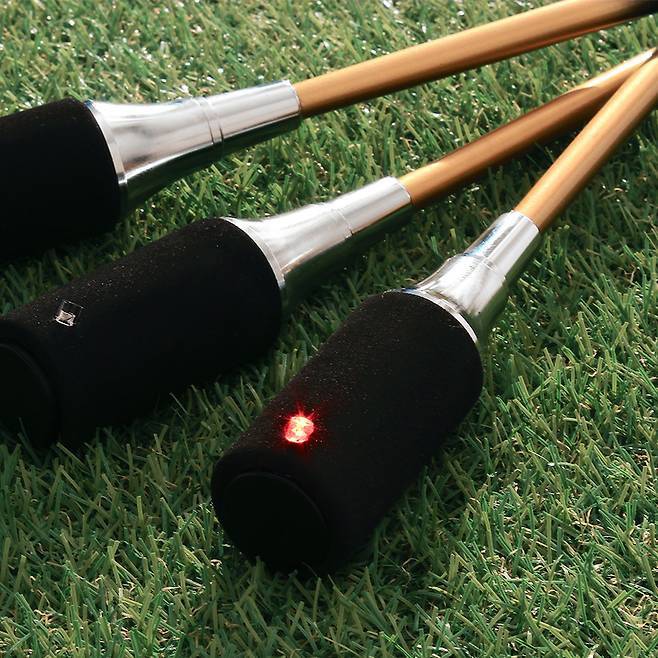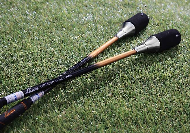 골퍼들이 스윙 연습기에