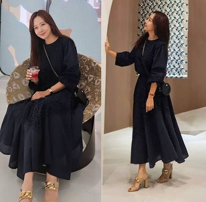 공개한 사진에서 멋스러운 다크 네이비의 롱 원피스로 품격있는 전시회 나들이룩을 완성했다.