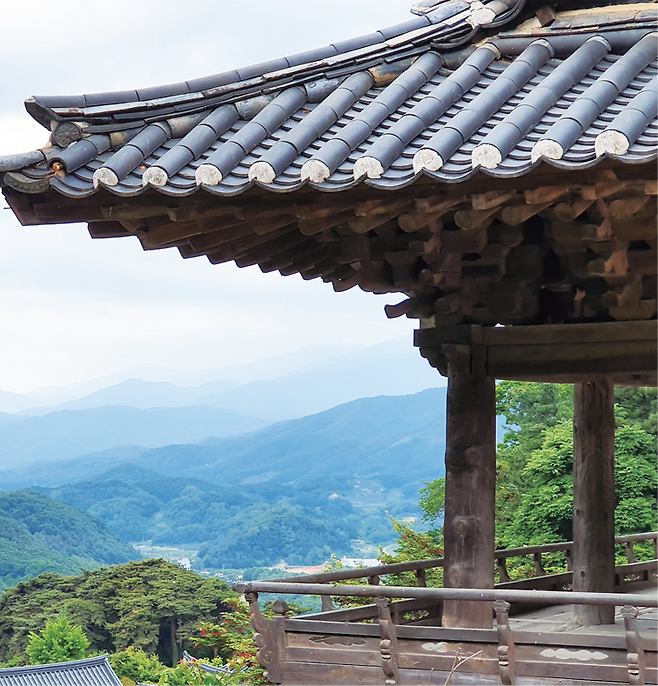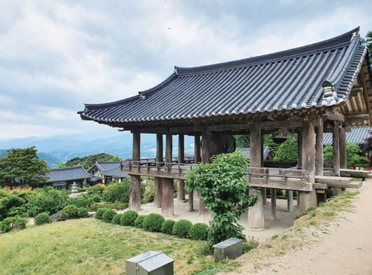 범종각이 정면을 향했다면 무겁고 시야가 답답했을 것이고, 뒤쪽 맞배지붕 끝을 더들어 올려 건물이 날아갈 듯한 느낌을 만드니 연이어 있는 산맥과 자연스럽게 이어지며 멋들어진