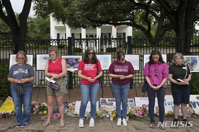 [오스틴=AP/뉴시스] 24일(현지시각) 미 텍사스주 오스틴에 있는 그레그 애벗 주지사 관저 밖에서 유밸디 초등학교 총기참사 희생자 추모식이 열려 참가자들이 묵념하고 있다. 1년 전 유밸디의 롭 초등학교에 당시 18세의 총격범이 난입해 총기를 난사, 초등학생 19명과 교사 2명을 살해하고 18명을 다치게 했다. 2023.05.25.