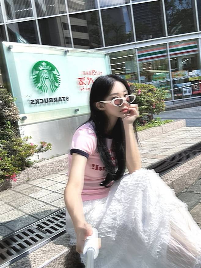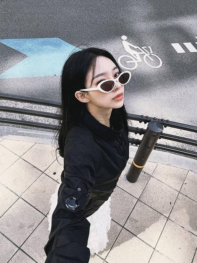 여기에 화룡점정을 찍은 아이템은 바로 선글라스. 하트 프레임처럼 보이는 오버사이즈 선글라스는 그녀의 작고 갸름한 얼굴형과 잘 어울리며, 룩에 위트 있는 분위기를 더한다. 전체적으로 핑크-화이트-블랙이 조화롭게 어우러져 컬러감 있는 여름 도심룩을 완성했다.