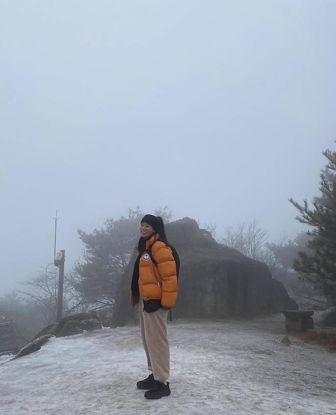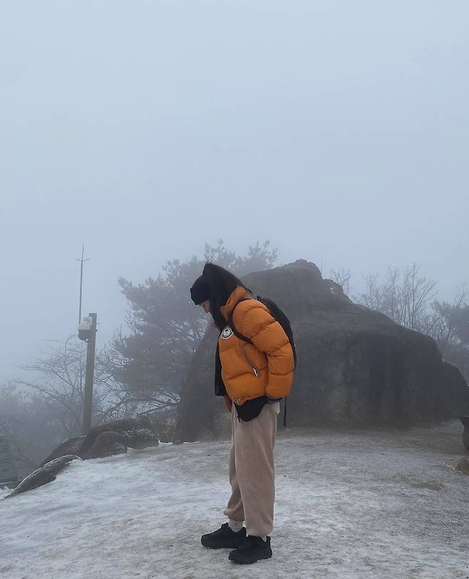 안개가 자욱한 겨울 산을 배경으로 한승연은 활동적이면서도 따뜻한 등산 패션을 선보였어요.