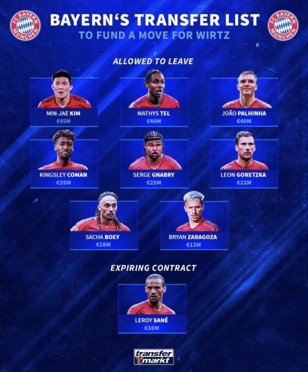 유럽 축구 이적 전문 사이트 ‘트랜스퍼 마크트’는 10일(한국시간) “비르츠 영입을 위한 뮌헨의 이적 허용 리스트”라면서 비르츠의 영입을 위해 자금을 마련해야 한다고 전했는데, 김민재도 이 리스트에 포함됐다. 토트넘 임대 생활 중인 마티스 텔을 비롯해 주앙 팔리냐, 킹슬리 코망, 세르주 그나브리, 레온 고레츠카, 사샤 보이, 브리안 사라고사(오사수나) 등이 이 명단에 이름을 올렸다.