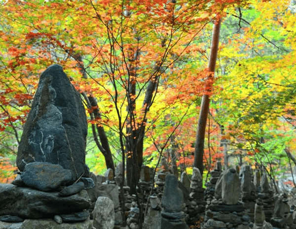 노추산 모정탑길은 돌탑이 줄지어 서 있는 신비로운 산책로로, 가을이 되면 가장 아름다운 길 중 하나로 손꼽히는데요. 길을 따라 걷다 보면 돌탑 사이로 단풍잎이 흩날리며 마치 영화 속 장면 같은 풍경을 만들어냅니다. 평화롭고 고요한 분위기 속에서 자연이 들려주는 소리에 귀 기울이게 됩니다.