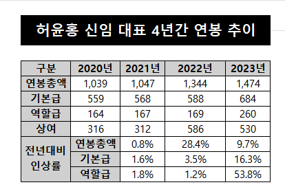 허 대표가 처음 5억원 이상의 연봉을 수령한 2020년에 기본 급여는 7억2300만원이었다. 당시 기본연봉은 5억5900만원, 역할급은 1억6400만원이었다.