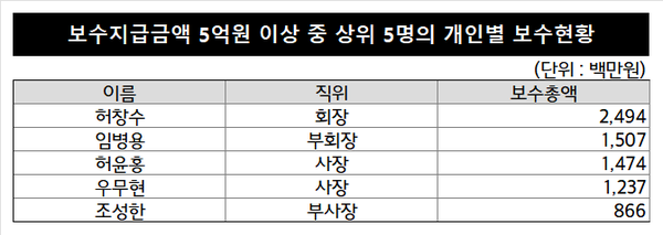 허 대표는 지난해 9억4400만원의 기본 급여를 수령했다. 임원 임금 테이블에 따라 기본급 6억8400만원이 지급됐고, 담당 직무와 직위 등을 고려해 2억6000만원이 추가로 지급됐다.