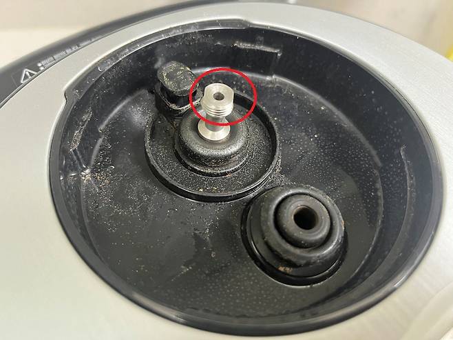 빨간색 표시된 부분이 증기배출구입니다. 증기배출구가 막히면 내부 압력이 비정상적으로 높아지고 김이 새거나 물이 흘러나올 수 있습니다. 밥솥 밑에 부착된 핀이나 바늘 등으로 이곳을 찔러 막힘 여부를 확인하세요.