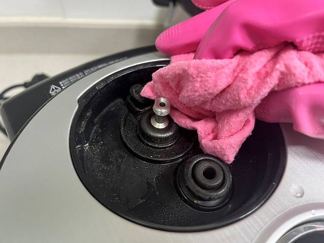 압력추를 분리한 후 주변에 쌓인 먼지 등도 깨끗하게 닦아 제거합니다. 틈새 부분은 면봉을 활용하면 더욱 깨끗하게 청소할 수 있습니다.