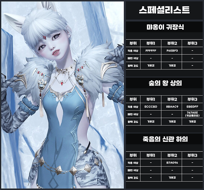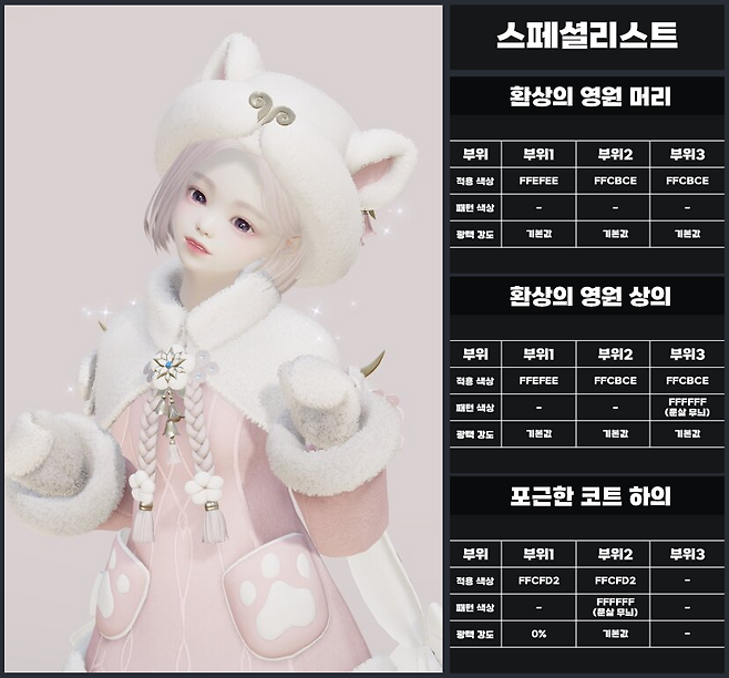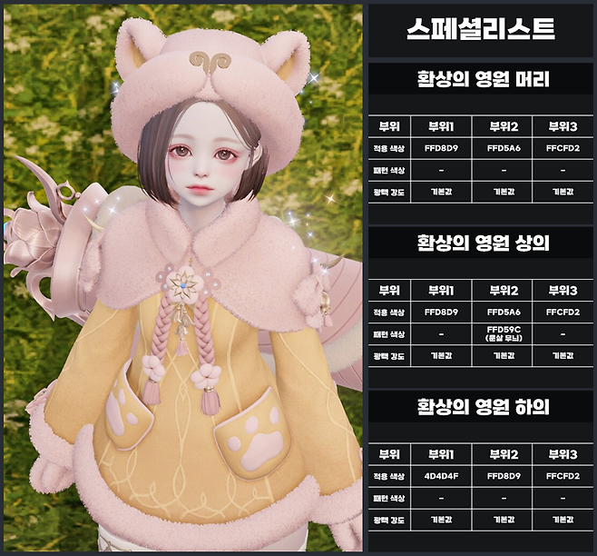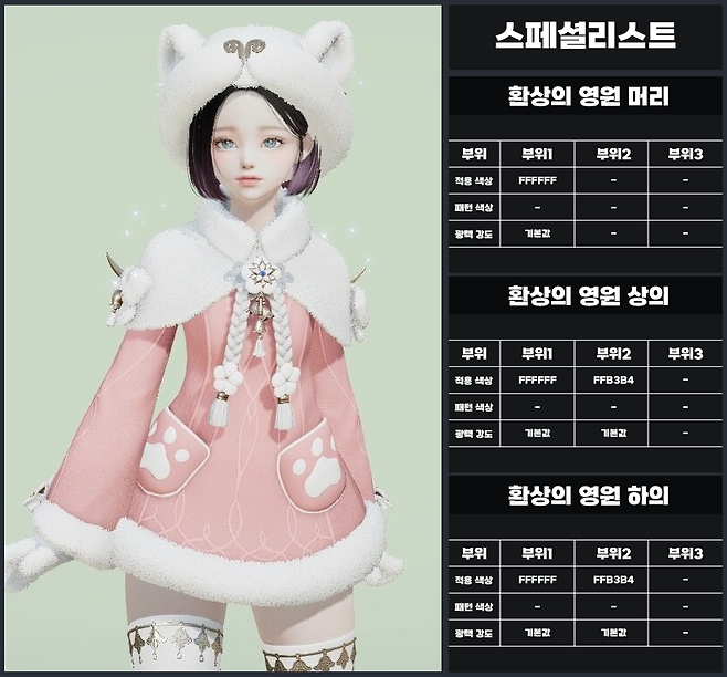 환수사 전압 입어보고가요 심플한 색 구성으로 원본의 느낌은 최대한 살리며, 메인 컬러의 변화로 색다른 느낌을 주는 환상의 영원 아바타 염색 코드입니다. 스페셜리스트 특유의 귀여운 이미지를 한껏 돋보이게 할 수 있는 디자인인 만큼, 핑크 계열의 색상과 조합이 좋은 것으로 보입니다.