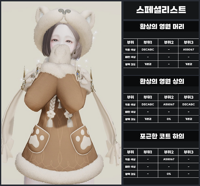 환수사 어그느낌 곰돌이염색! '어그'하면 생각나는 대표적인 컬러인 체스트넛을 활용해 겨울 계절과 어울리는 색감으로 염색한 환상의 영원 아바타 염색 코드입니다. 어그라는 콘셉트와 어울리도록 상의는 포근한 코트 하의로 코디를 완성한 점이 인상적인데요. 전체적으로 겨울과 잘 어울리는 색감인 만큼, 디자인 완성도가 높은 것으로 보입니다.
