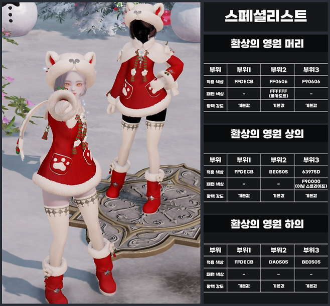 환수사 : 환상의 영원(거룩한 밤) 산타 복장의 거룩한 밤 아바타 디자인으로 염색된 환상의 영원 아바타 염색 코드입니다. 전체적인 색 구성이 크리스마스에 잘 어울리는 모습인데요. 환상의 영원 아바타 특유의 귀여운 디자인 덕에 한층 더 귀여운 모습을 연출할 수 있는 것으로 보입니다.