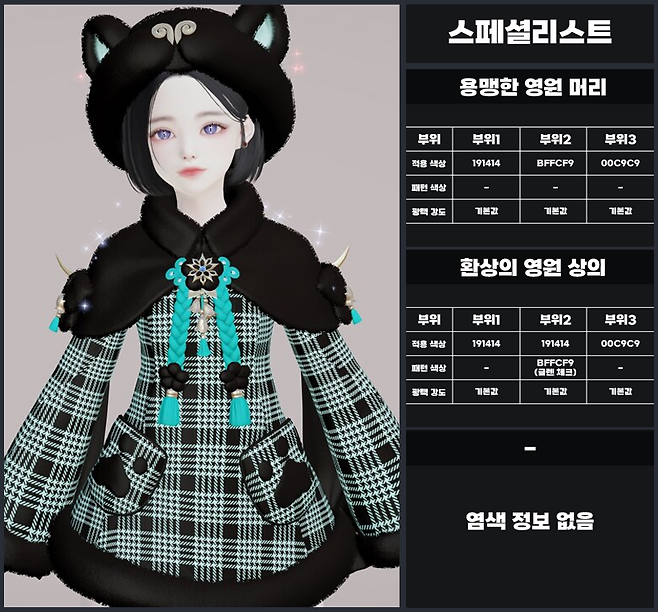 환수사 전압&6주년[전압 염색코드 추가] 민트의 독특한 색감과 패턴을 활용한 포인트가 돋보이는 환상의 영원 아바타 염색 코드입니다. 털 질감인 모자와 숄더 부분의 검은색과 대비되는 민트 색상의 패턴이 인상적인데요. 민트 색상 특유의 상쾌함이 느껴지는 디자인으로 민트색을 좋아한다면 고민 없이 선택해도 좋을 것 같네요.