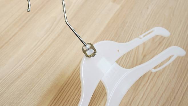 옷걸이 윗부분에 캔따개 윗부분을 걸어 주세요. 그리고 두 번째 구멍에 다른 옷걸이를 걸어 사용해 볼 거예요.